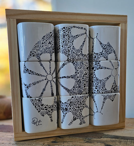 Our signature product is our Square Mug Doodle Puzzle that includes 9 mugs that when placed in the frame form a unique piece of Doodle Art.