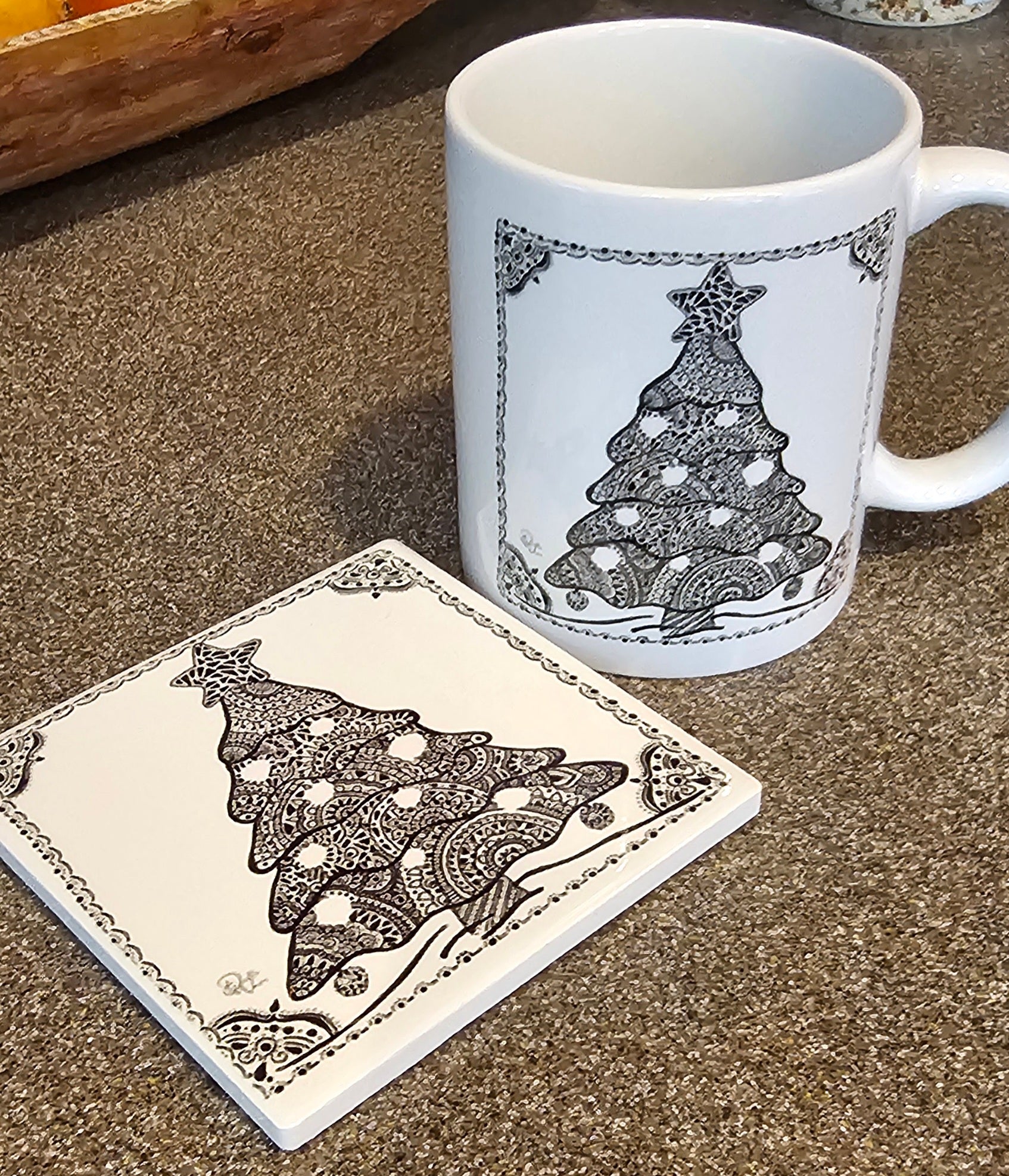 Doodle Design White Cermaic Coaster - Christmas Tree