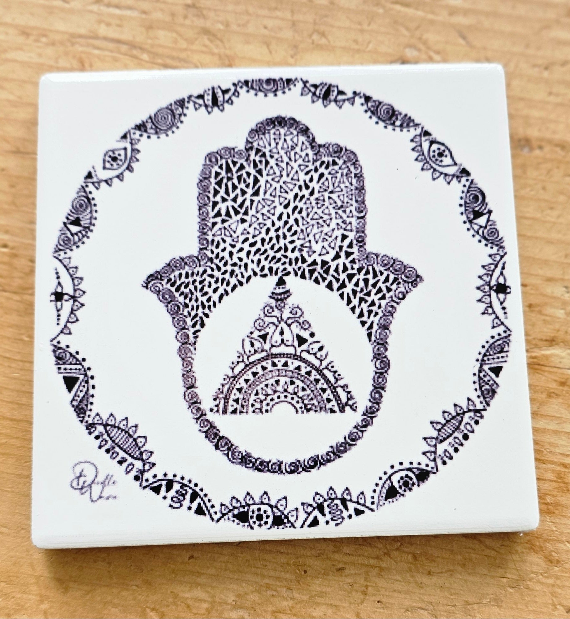 Doodle Design White Cermaic Coaster - Hamsa 21