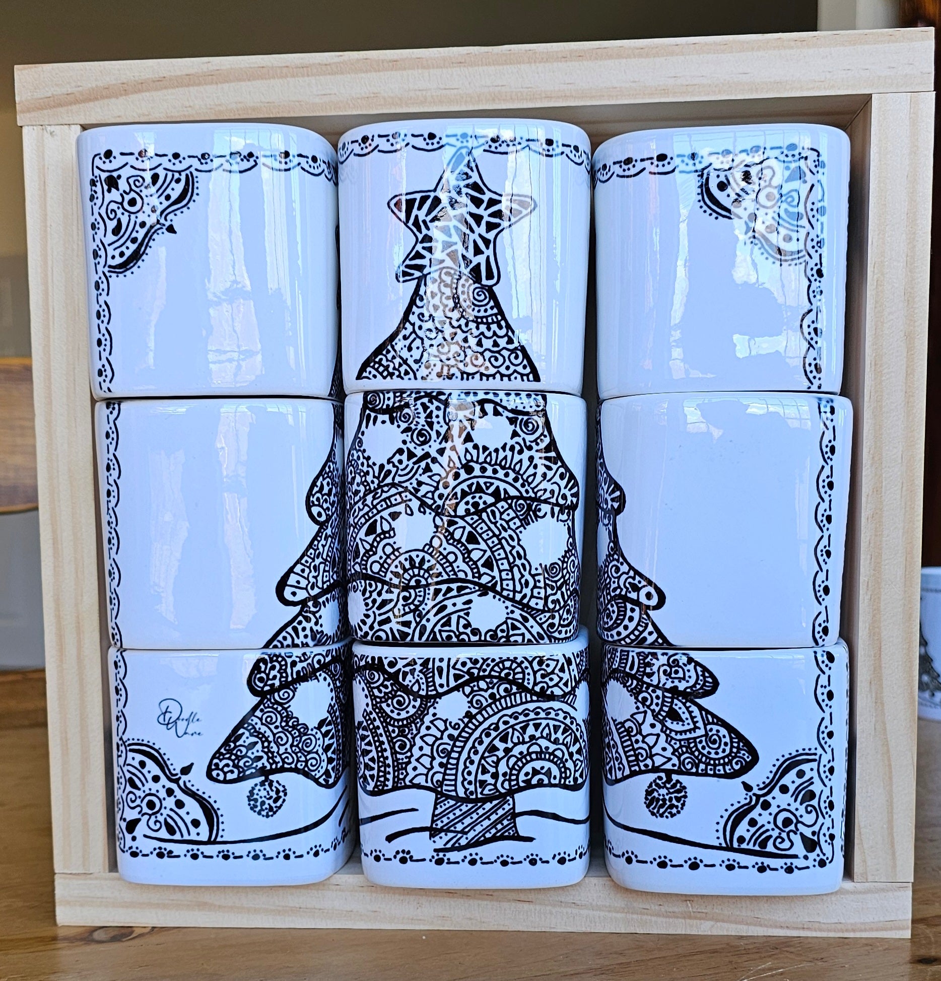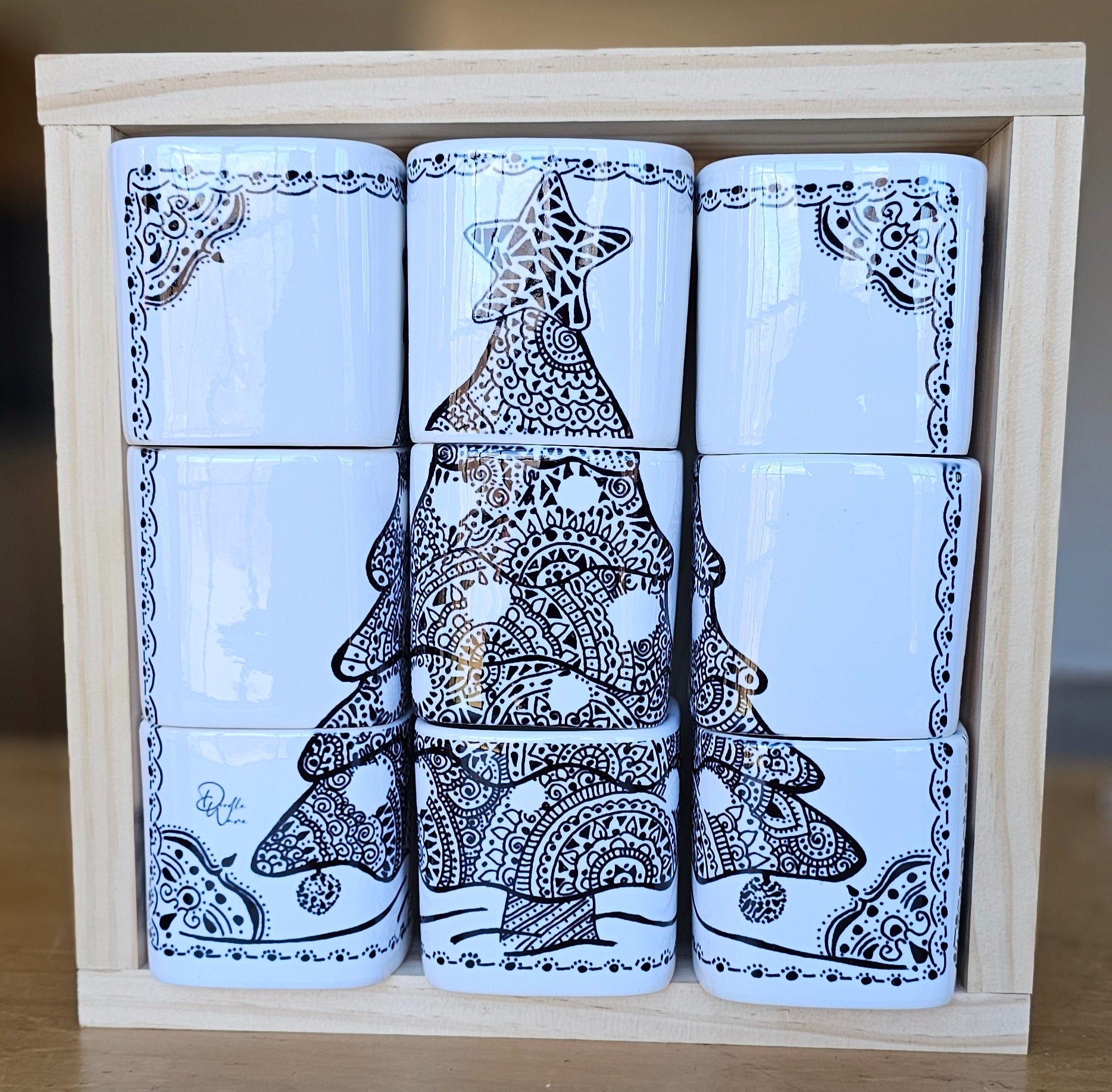 Unique set of nine square mugs that when placed together in the frame they come with form an original design.