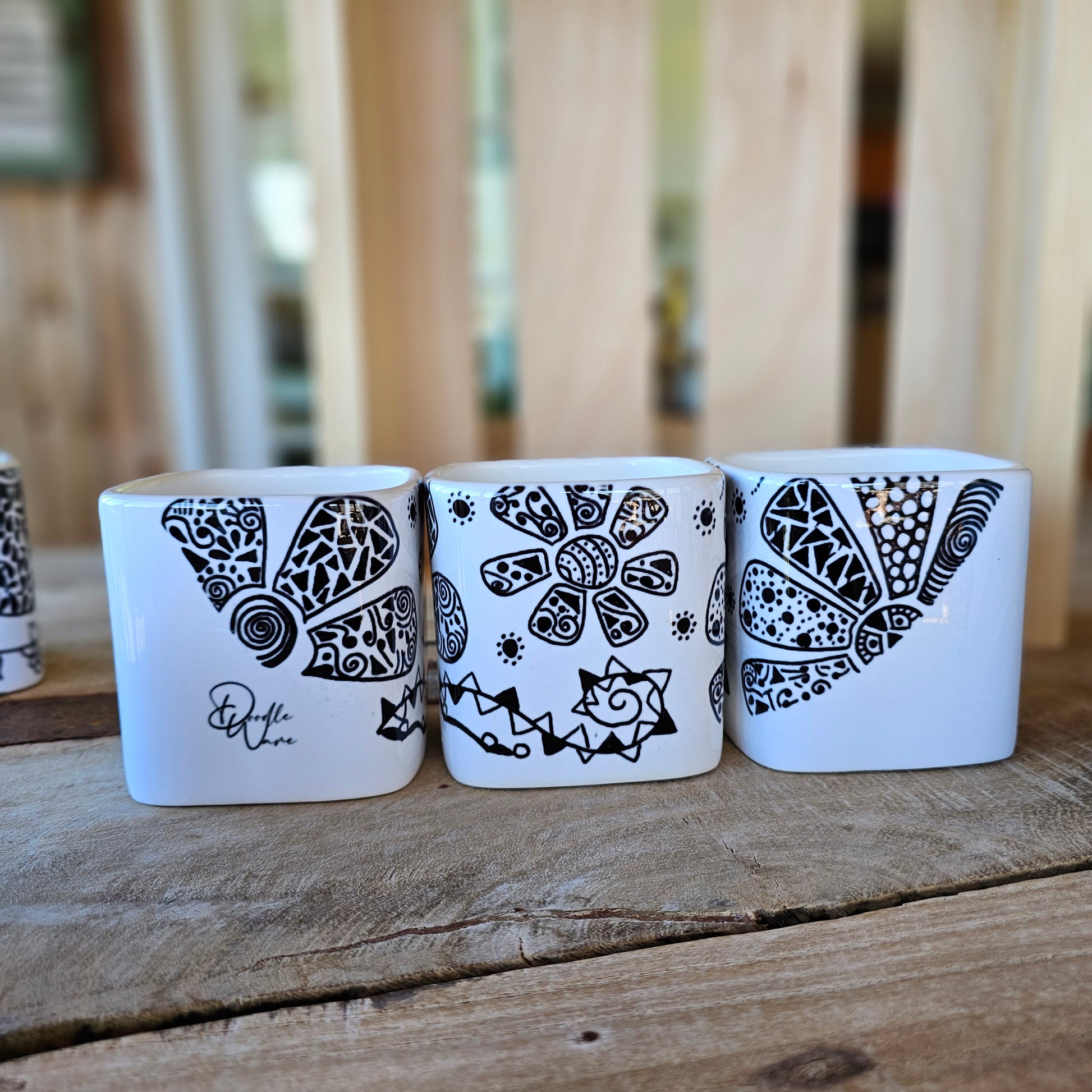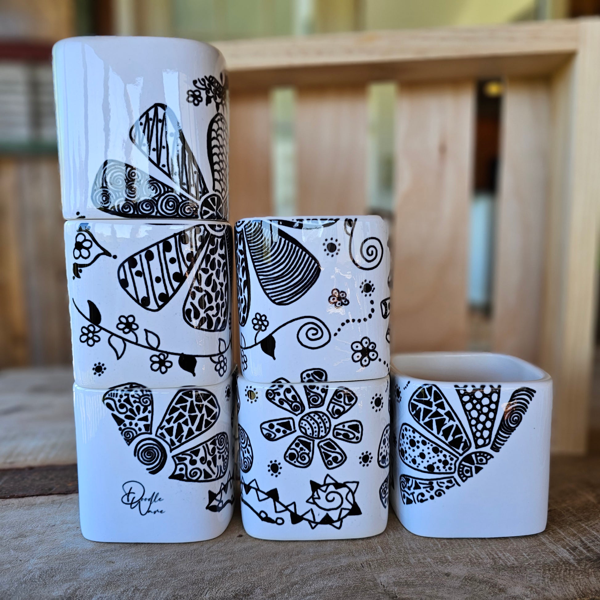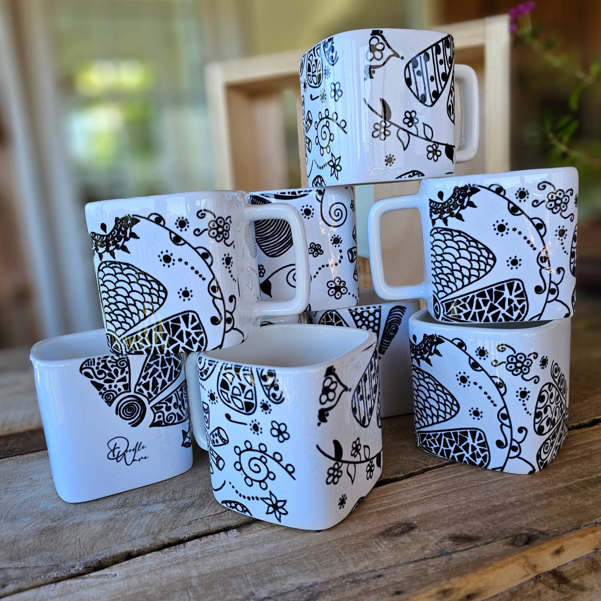 Each mug measures 3 1/8" x 3 1/8" x 3 1/8" . A unique square design.