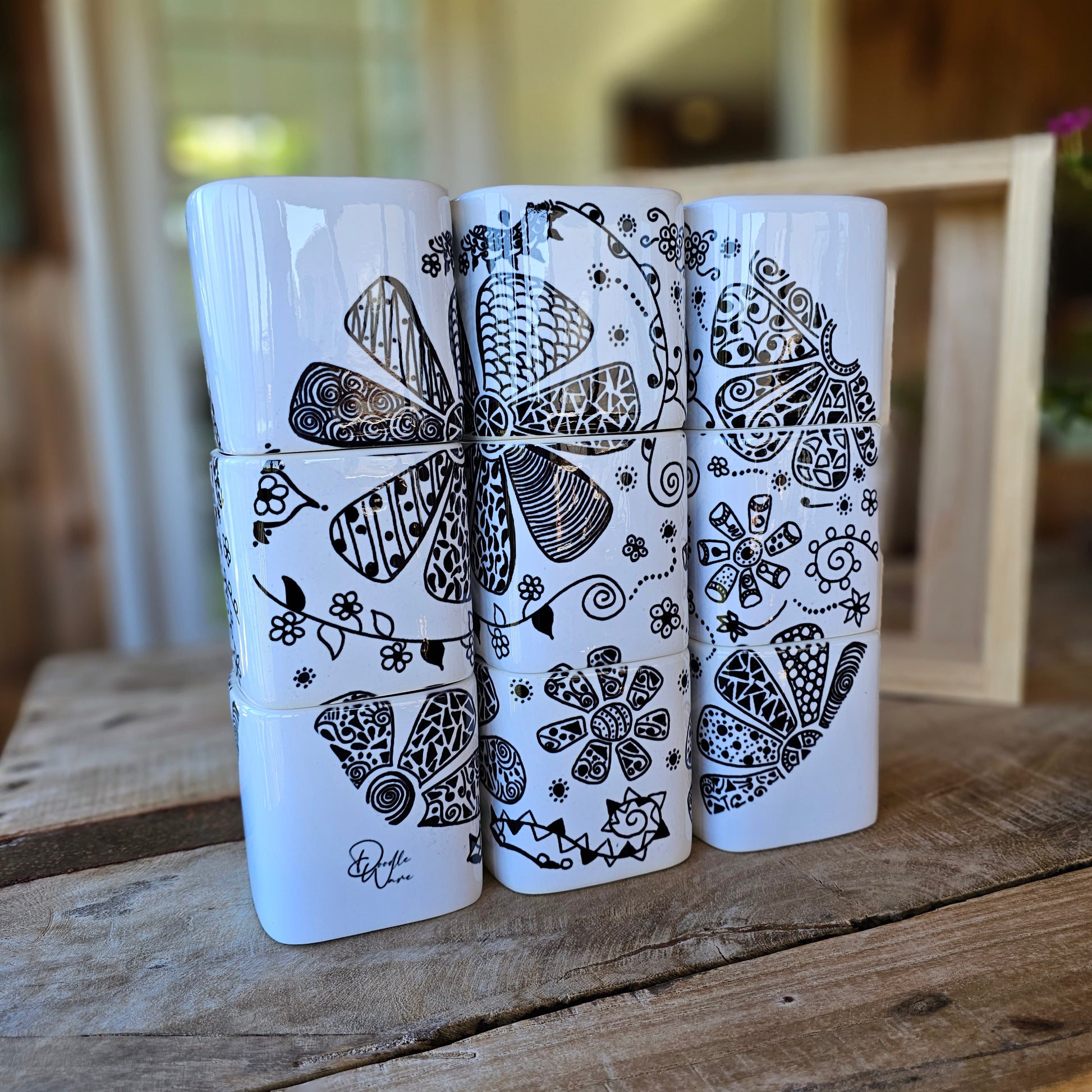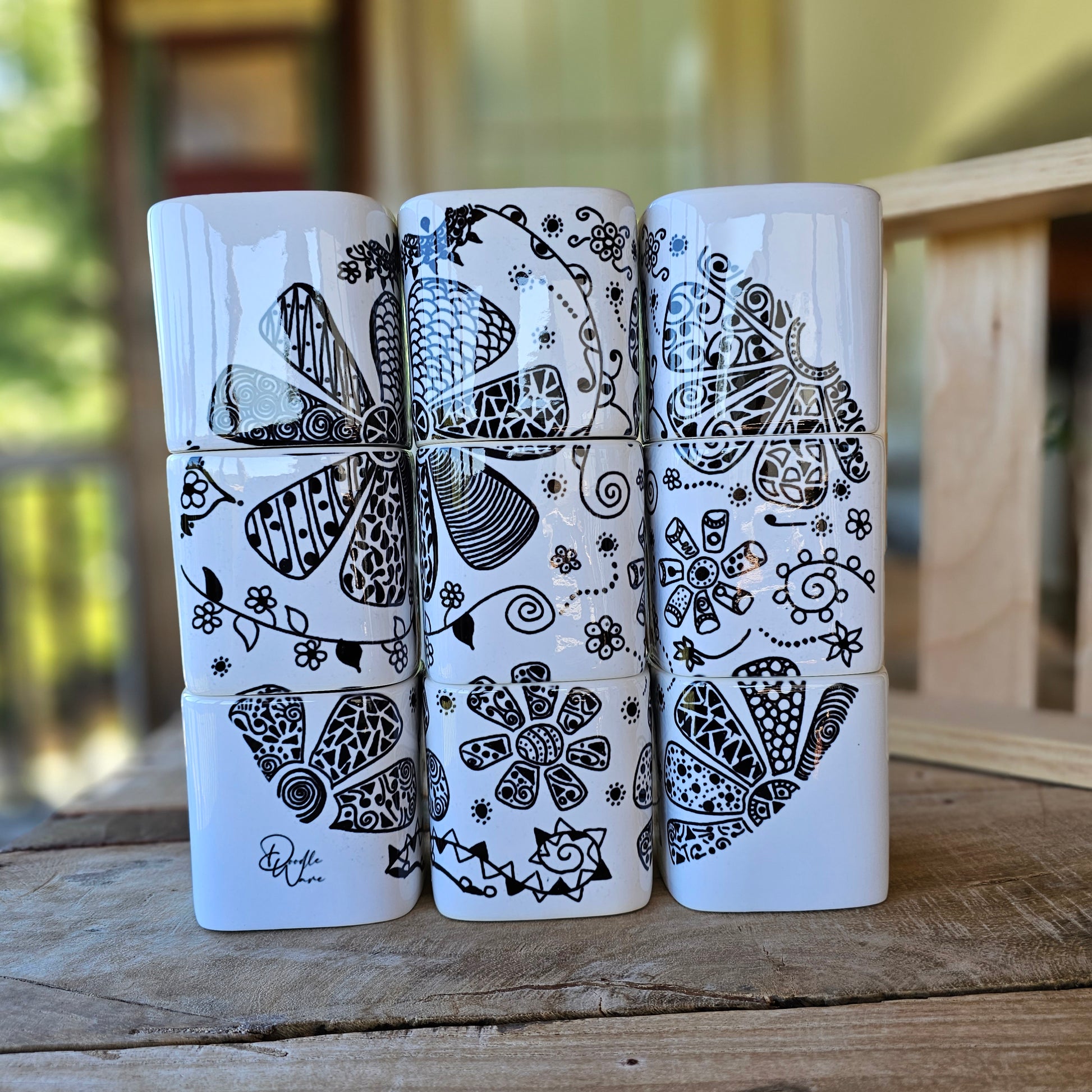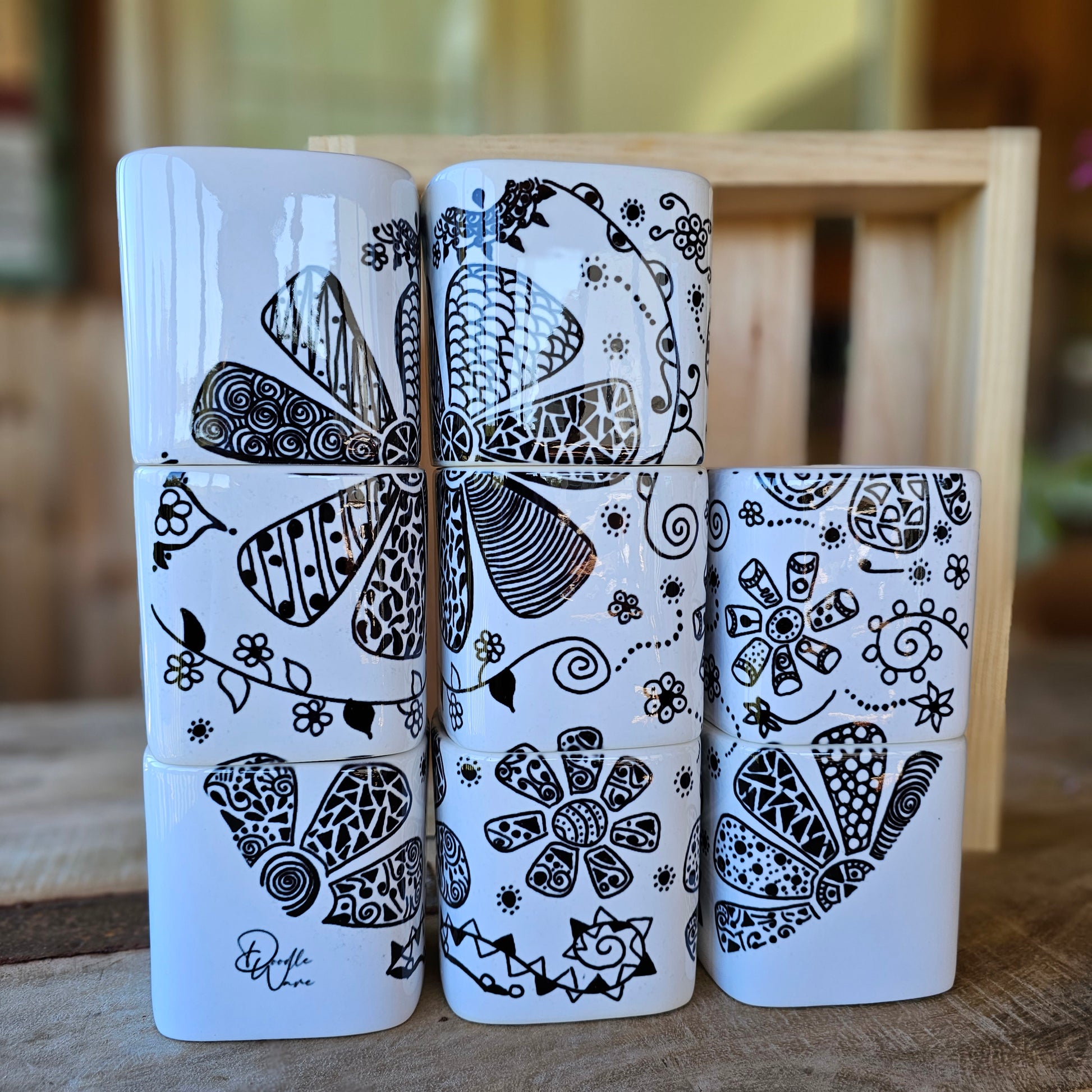 Each mug measures 3 1/8" x 3 1/8" x 3 1/8" . A unique square design.
