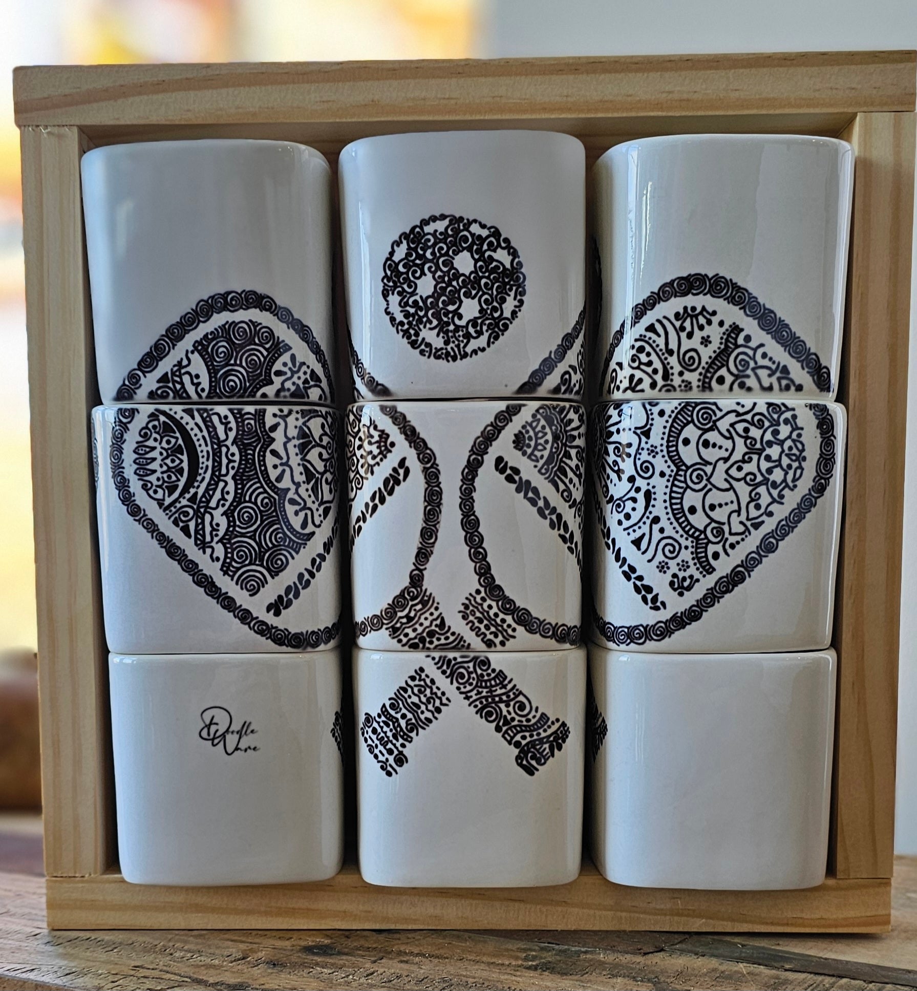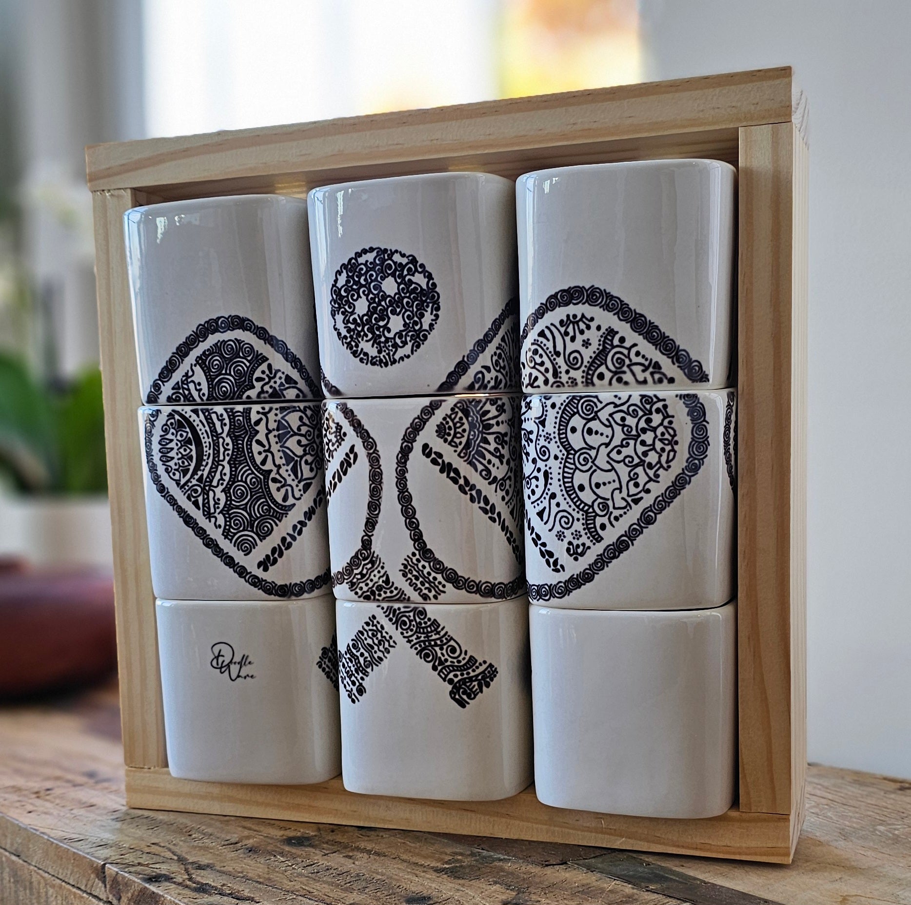 Unique set of nine square mugs that when placed together in the frame they come with form an original design.