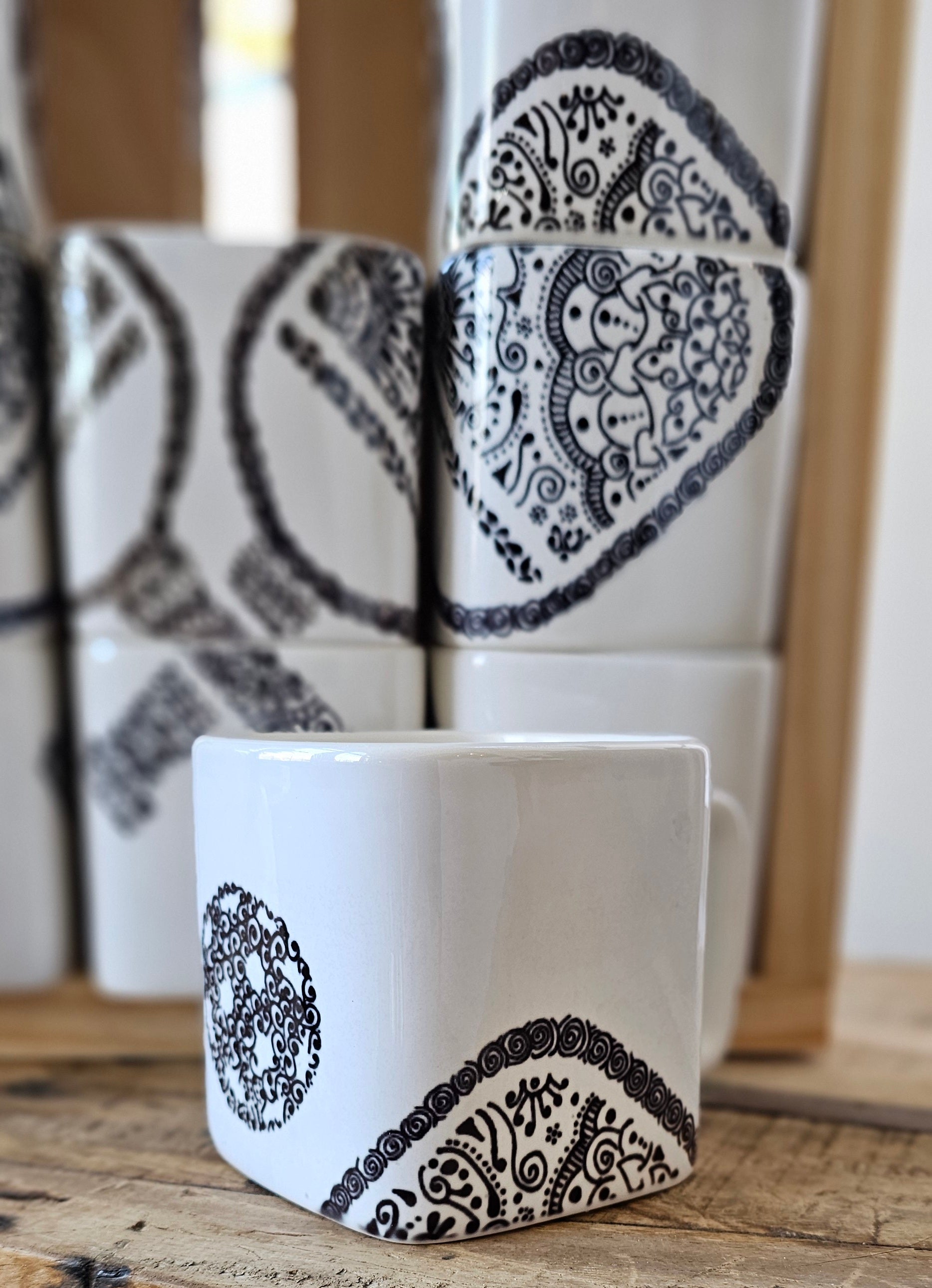 Each mug measures 3 1/8" x 3 1/8" x 3 1/8" . A unique square design.